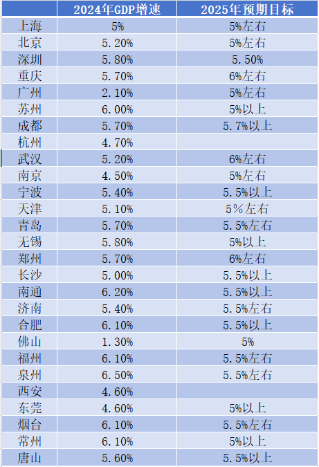 梳理各地的目标,一些城市今年的目标相比2024年的实际增速有大幅提高。2024年,广州、佛山和东莞分别增长了2.1%、1.3%和4.6%,今年目标分别是5%左右、5%和5%以上;南京、长沙和武汉去年分别增长4.5%、5%和5.2%,今年目标分别是5%左右、5.5%以上和6%左右。